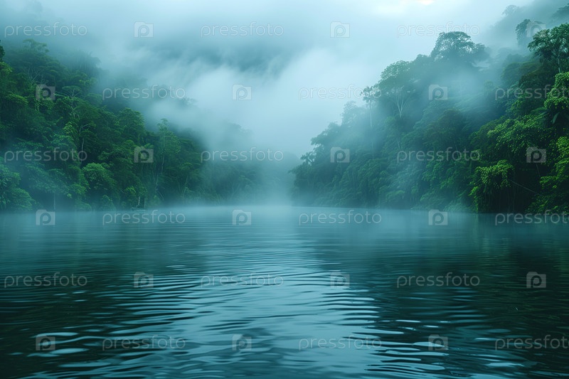 Горное озеро с туманом утром,