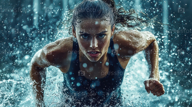 Решительная спортивная женщина тренируется под ливнем