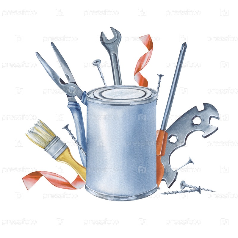 Акварельная композиция с банкой краски и мужскими инструментами для ремонта дома. Иллюстрация с железными инструментами нарисована от руки на белом фоне