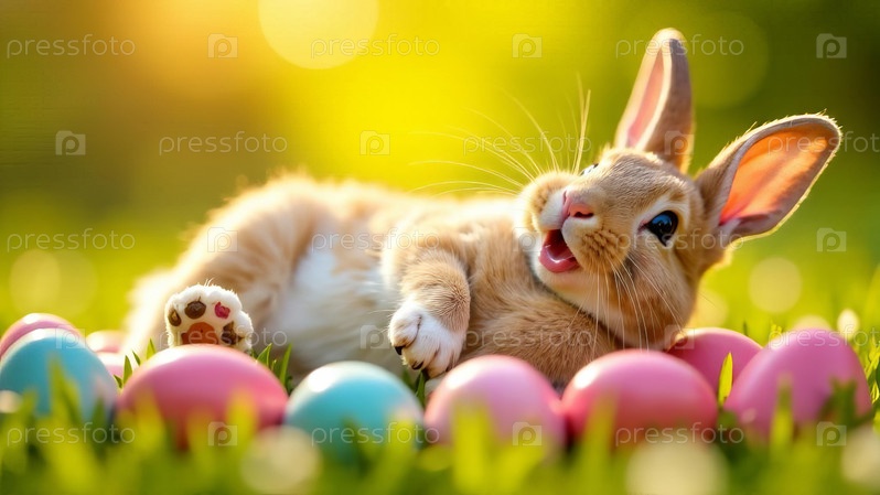 Счастливый кролик с красочными пасхальными яйцами на залитой солнцем траве