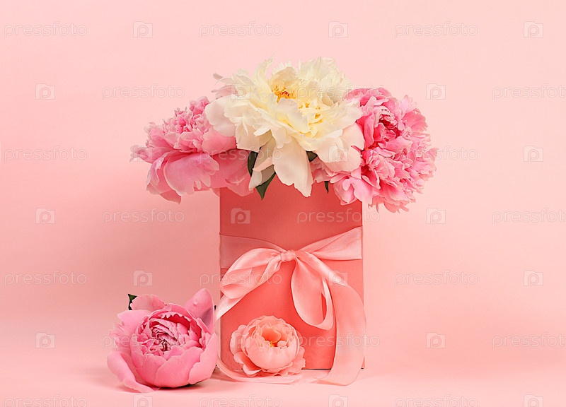 Нежные цветы пионов и роз в розовой подарочной коробке. Абстрактная цветочная композиция, концепция подарков на праздник, день рождения, свадьбу и день матери. Весенний натюрморт и баннер для экрана