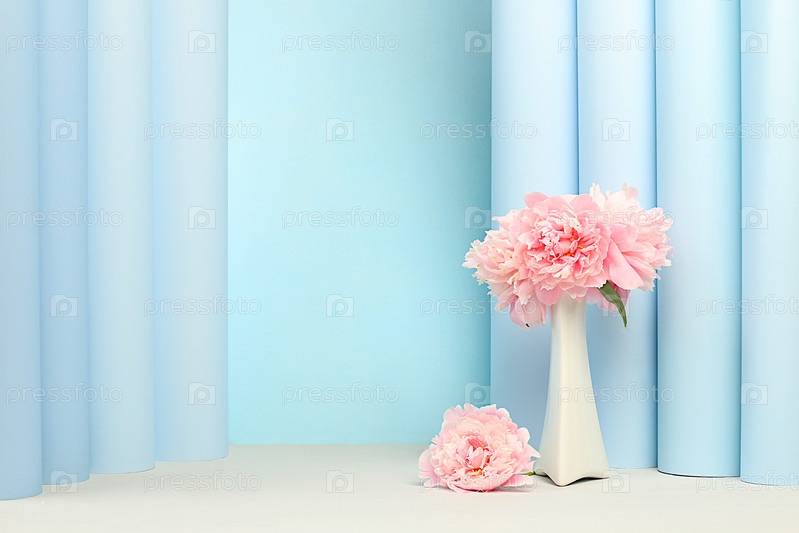 Абстрактная цветочная композиция с нежными пионами и розами в вазе на элегантном современном фоне. Весенний натюрморт и баннер для экрана, пустой подиум для демонстрации продукта, концепция красоты