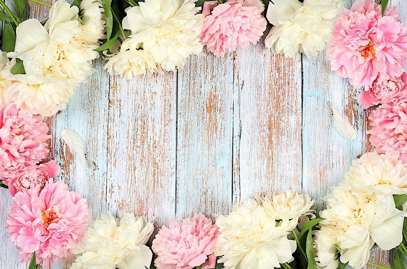 Рамка из нежных красивых цветов пионов, роз на солнечном столе. Весенний натюрморт и баннер для экрана, элегантная концепция красоты, шаблон для дизайна. Абстрактная цветочная композиция