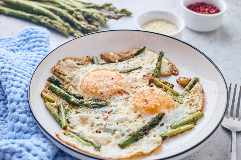 Яичница со спаржей и тертым сыром. Концепция завтрака