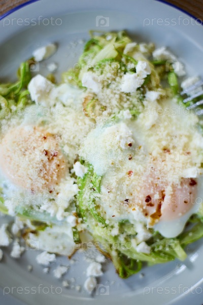 Завтрак с жареным яйцом в гнезде из цуккини с сыром фета, здоровый завтрак, вид сверху, крупный план