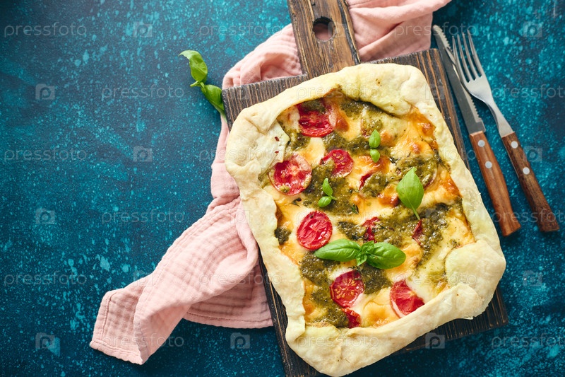 Пирог типа галет из слоеного теста с начинкой из помидоров, сыра моцарелла и соуса песто. Галет Капрезе. Вид сверху