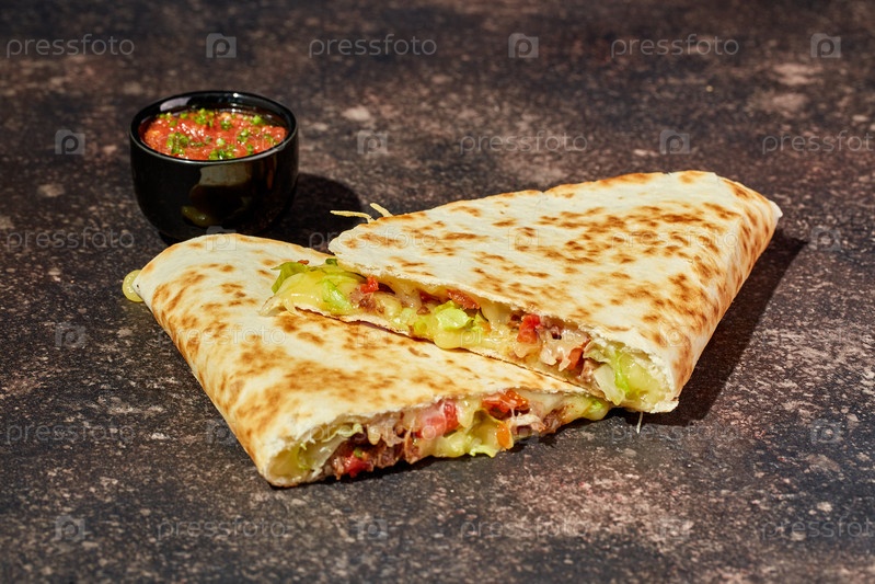 Кесадилья с курицей, сыром, овощами, зеленью и соусом