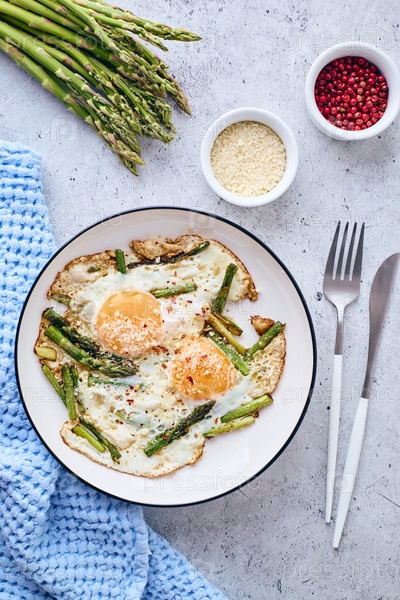 Яичница со спаржей и тертым сыром. Концепция завтрака. Вид сверху. Закрыть