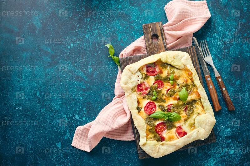 Пирог типа галет из слоеного теста с начинкой из помидоров, сыра моцарелла и соуса песто. Галет Капрезе. Вид сверху