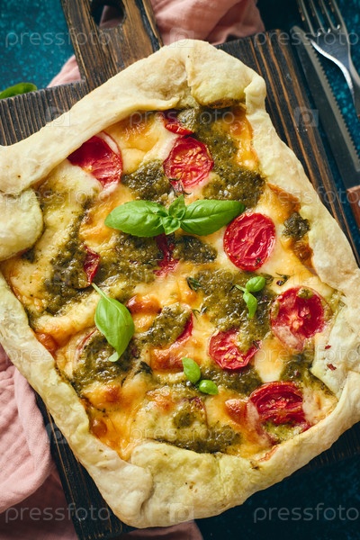 Пирог типа галет из слоеного теста с начинкой из помидоров, сыра моцарелла и соуса песто. Галет Капрезе. Вид сверху