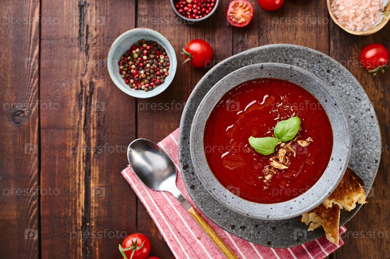 Густой, наваристый томатный суп-пюре, украшенный листьями базилика и специями в миске с жареными гренками на темном деревянном столе