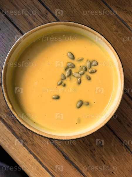 Крем-суп из тыквы с семенами на деревянном столе, вид сверху