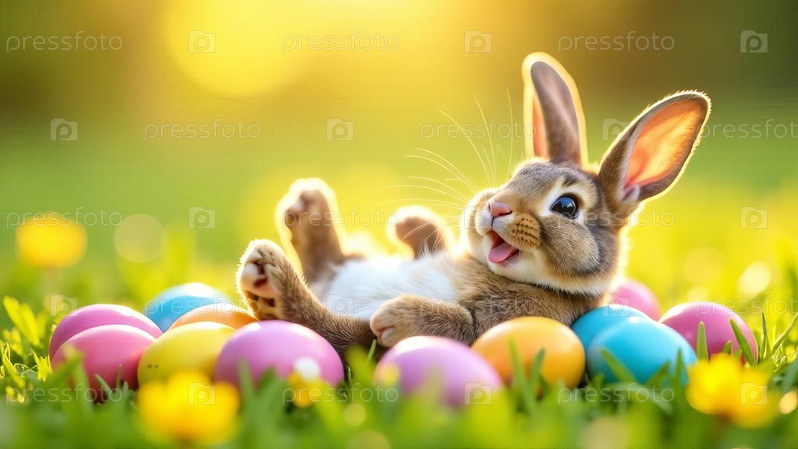 Счастливый кролик с красочными пасхальными яйцами на залитой солнцем траве