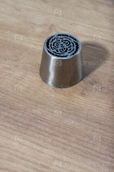 Наконечник для изготовления тюльпанов из маршмеллоу. Кондитерский наконечник из металла. Крупный план. Косой угол