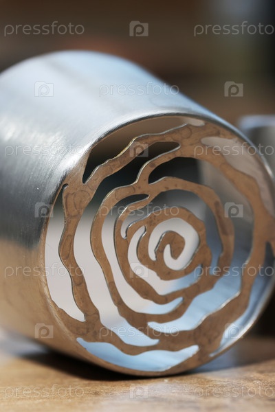 Насадка для изготовления тюльпанов из маршмеллоу. Насадка для выпечки из металла. Крупный план. Лежит на боку