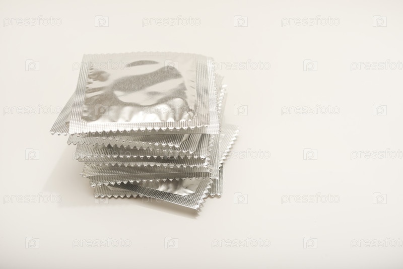 Презервативы в блестящей упаковке на белом фоне. Контрацептивы для мужчин
