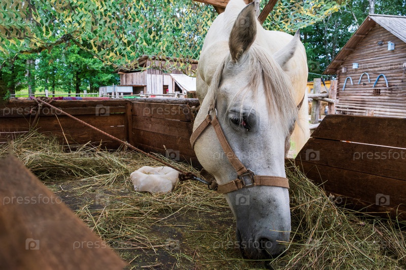 Белая лошадь ест сено в деревянной конюшне