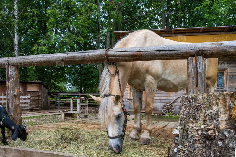 Лошадь и коза едят сено в деревенской обстановке фермы