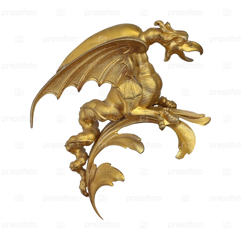 Золотой декоративный элемент "дракон" изолированный на белом фоне. Элемент дизайна с обтравочным контуром