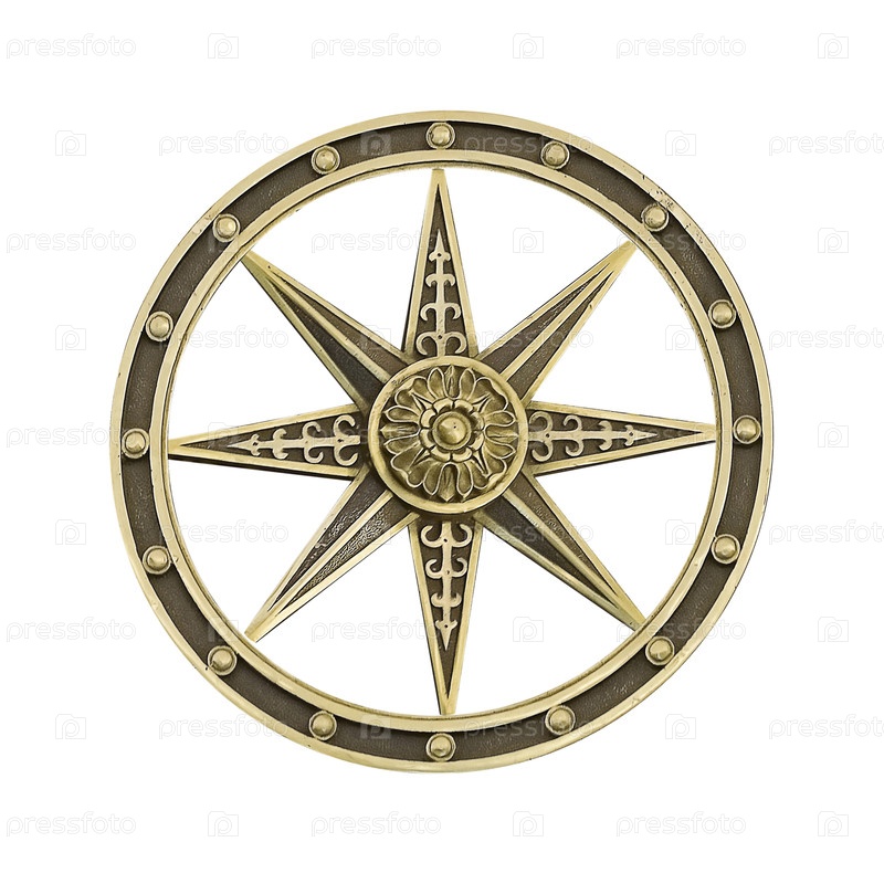 Золотой декоративный элемент (роза ветров) изолированный на белом фоне. Элемент дизайна с обтравочным контуром