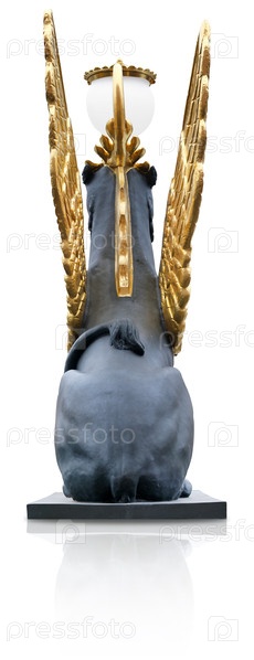 Бронзовый уличный фонарь (мифологический грифон с золотыми крыльями), изолированный на белом фоне. Элемент дизайна с обтравочным контуром
