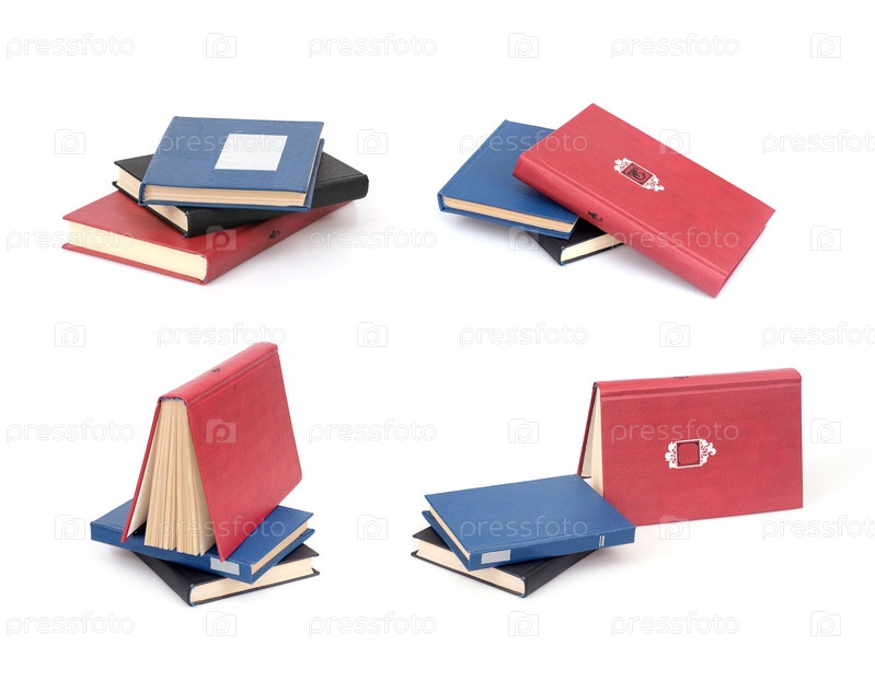 Стопки красных, черных и синих книг, изолированные на белом фоне