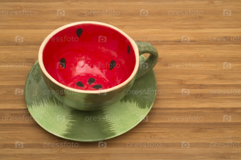 Чашка с блюдцем в форме арбуза на деревянном столе