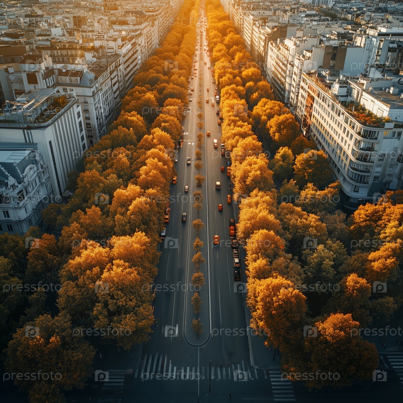 Вид с воздуха на оживленную дорогу, окруженную осенними деревьями на закате