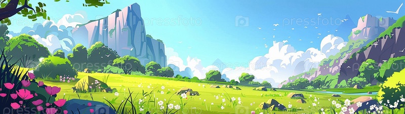 Летняя долина с цветами и деревьями. Панорамный рисунок
