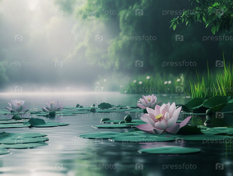 Безмятежные цветы лотоса, плавающие в туманном озере