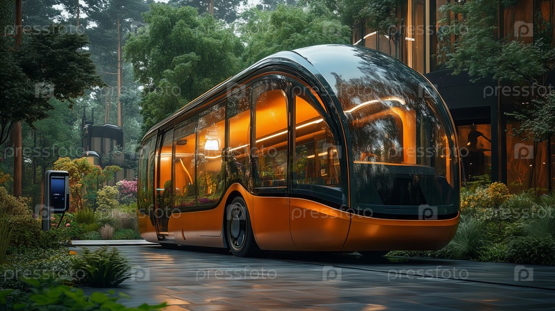 Футуристический электробус на солнечной зарядной станции в экопарке