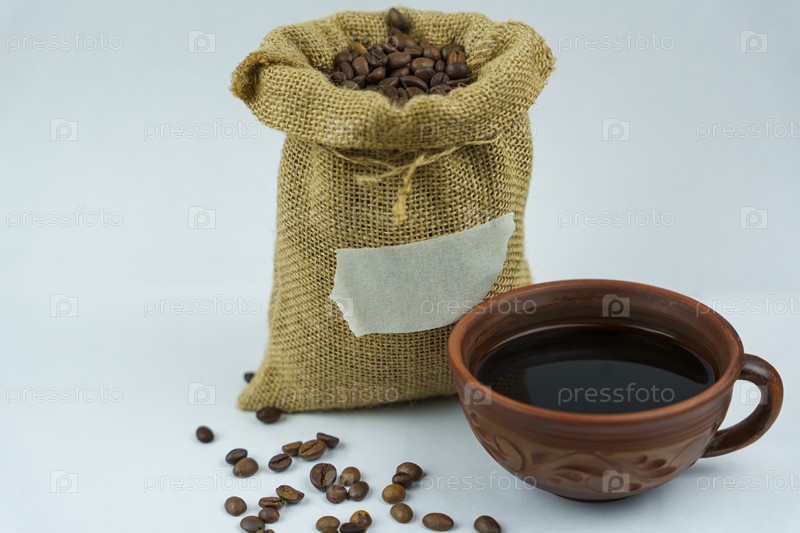 Мешок из мешковины с кофейными зернами, пустой этикеткой и чашкой кофе