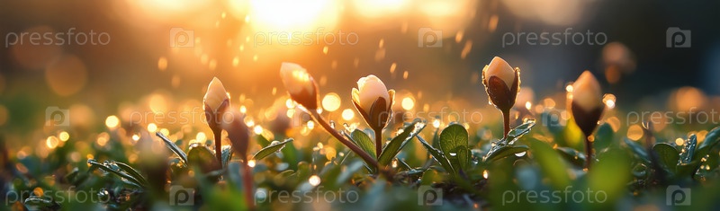 Желтый цветок, распускающийся в раннем утреннем свете с росой
