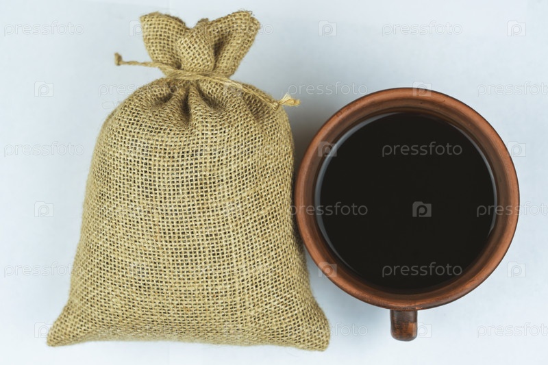 Мешок из мешковины и керамическая чашка кофе на белом фоне