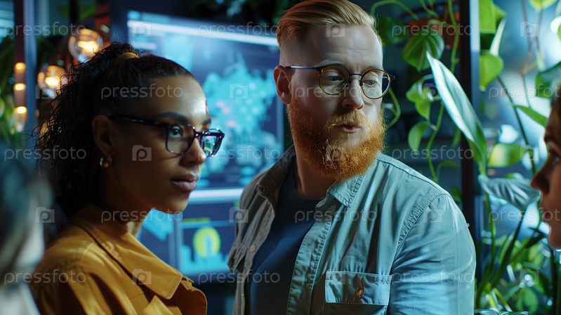 Разнообразная группа ученых-экологов, обсуждающих этику, экологию и будущее