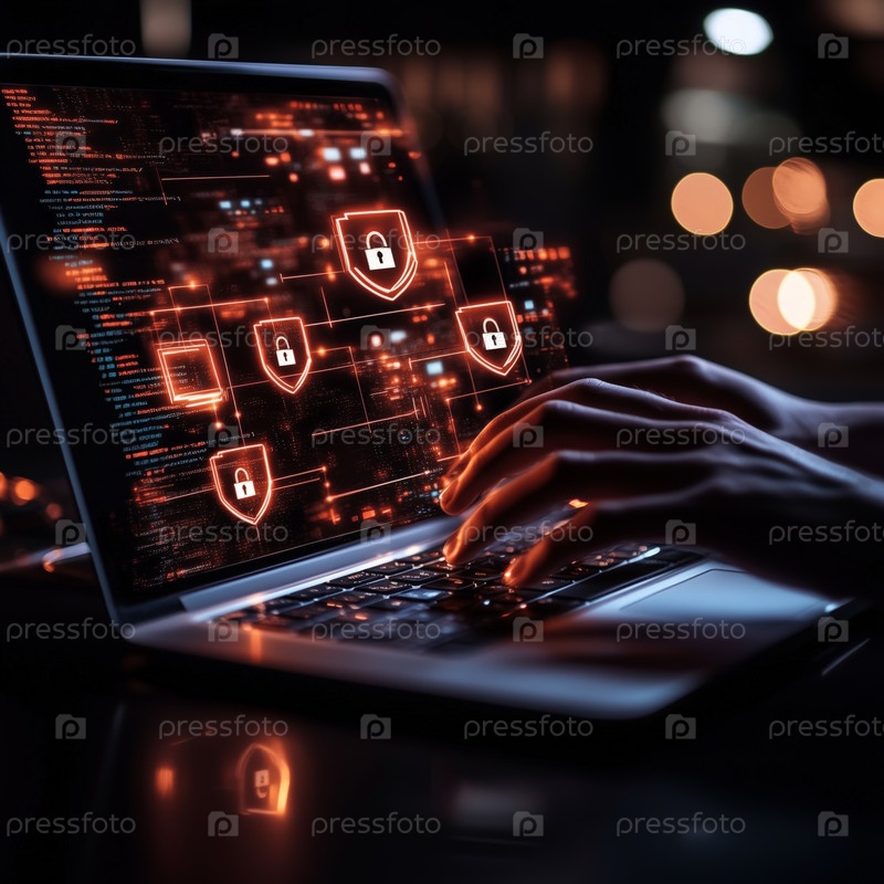 Руки печатают на ноутбуке со значками кибербезопасности на экране