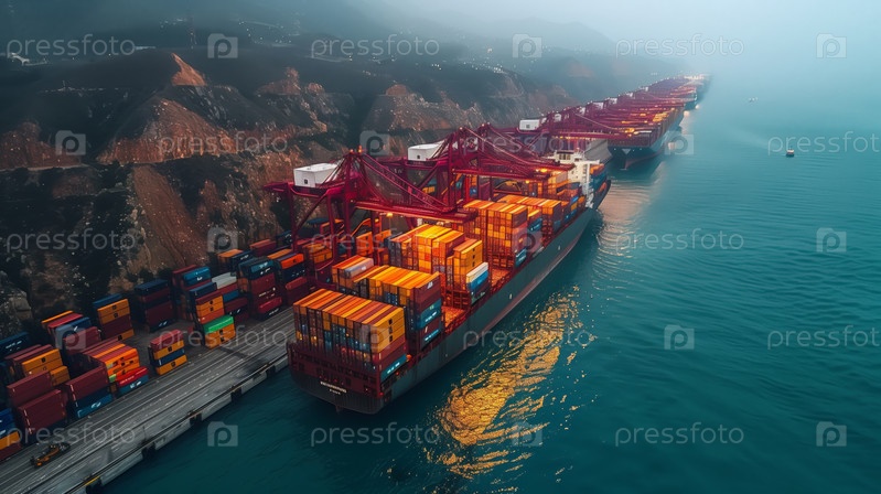 Вид с воздуха на грузовые суда и контейнеры в оживленном порту