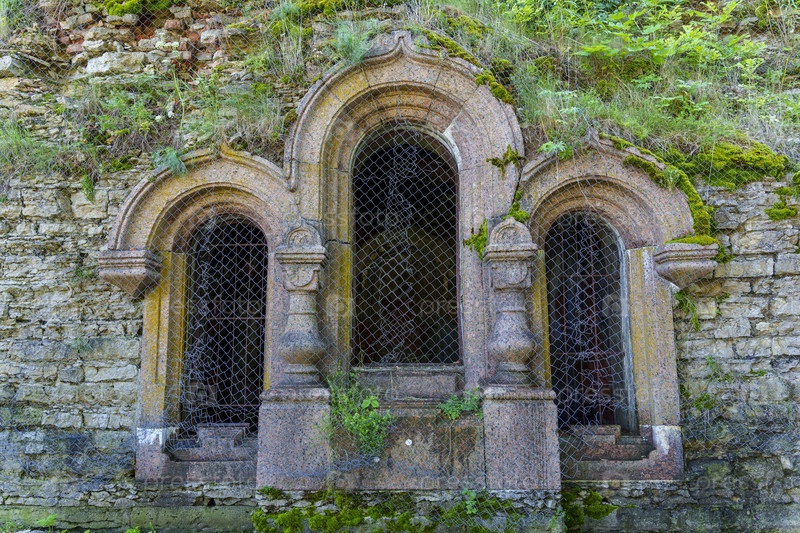 Древний каменный фасад с арочными окнами и мхом в исторической крепости