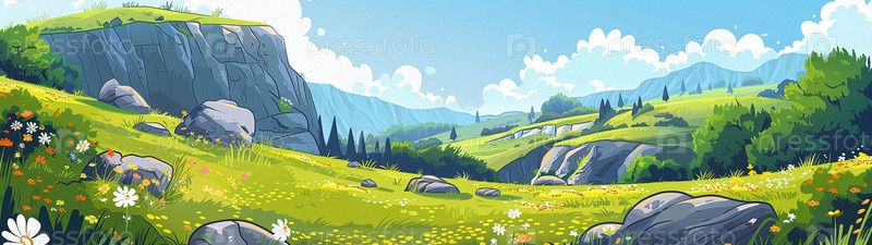 Летняя долина с цветами и деревьями. Панорамный рисунок