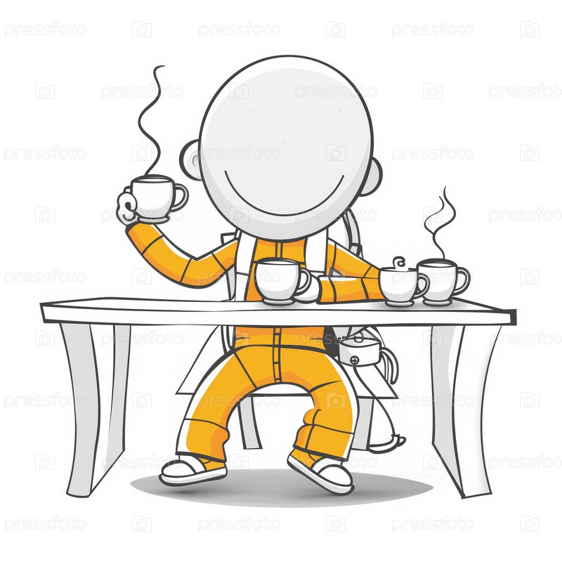 Стикмен пьет чай за столом с чайником и чашкой