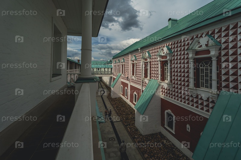 Вид с балкона исторического здания с красно-белыми узорчатыми стенами