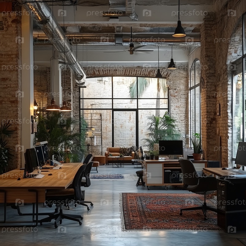 Офисное помещение в промышленном стиле в стиле лофт с открытой кирпичной кладкой и большими окнами