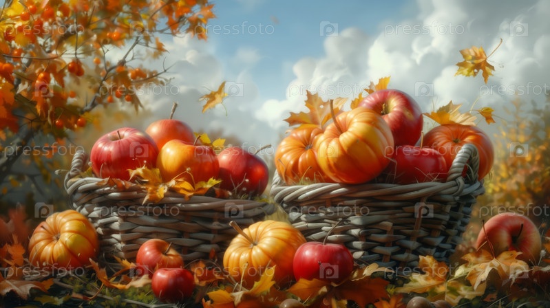 Корзины осеннего урожая с яблоками и тыквами