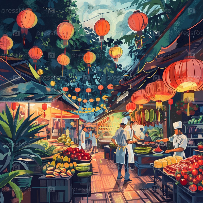 Азиатский рынок уличной еды. Готовка на улице, рынки с едой