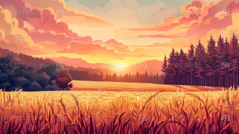 Осенний закат над полем зреющей пшеницы