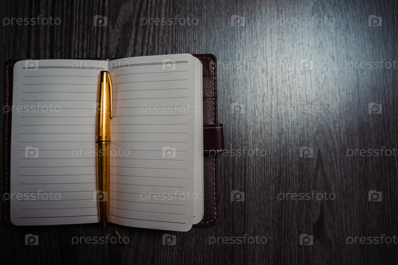 Блокнот с золотой ручкой на столе при свете свечи