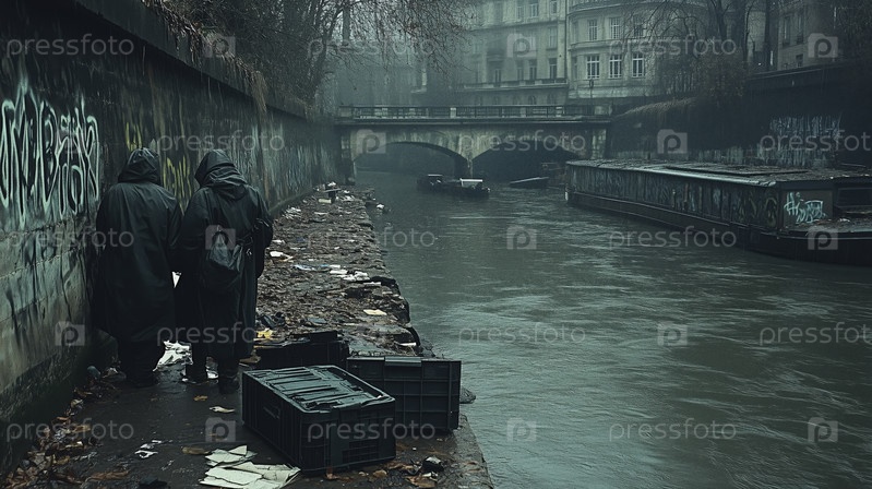 Заброшенный городской канал с заброшенными ящиками и граффити