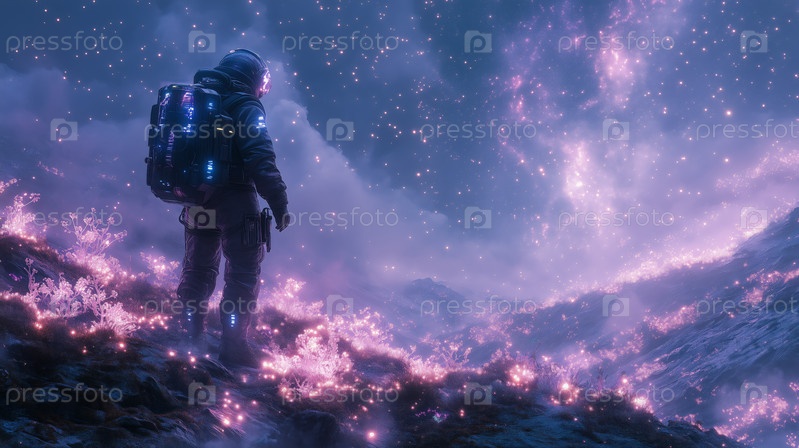 Астронавт исследует светящийся инопланетный ландшафт под звездным небом