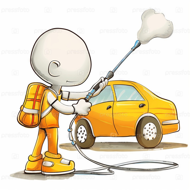 Стикмен моет машину из шланга, изолированный на белом фоне
