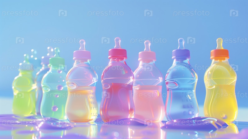 Красочные детские бутылочки в ряд с яркой подсветкой